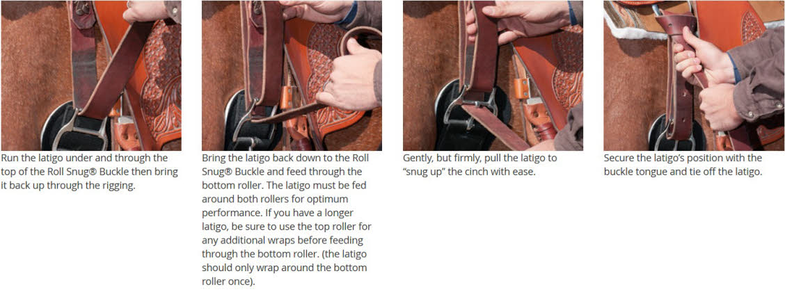 Før latigo reimen gjennom Roll Snug spennens øvre rulle og før den opp og igjennom riggingen i salen.